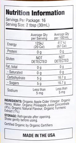 A delicious and functional tonic made from Bragg®️ Organic Apple Cider Vinegar infused with pineapple juice and turmeric. Crafted with organically grown apples, it’s raw, unfiltered, and lightly sweet–plus each bottle contains elements of our famous ‘Mother’ with 750mg of Acetic Acid per serving.